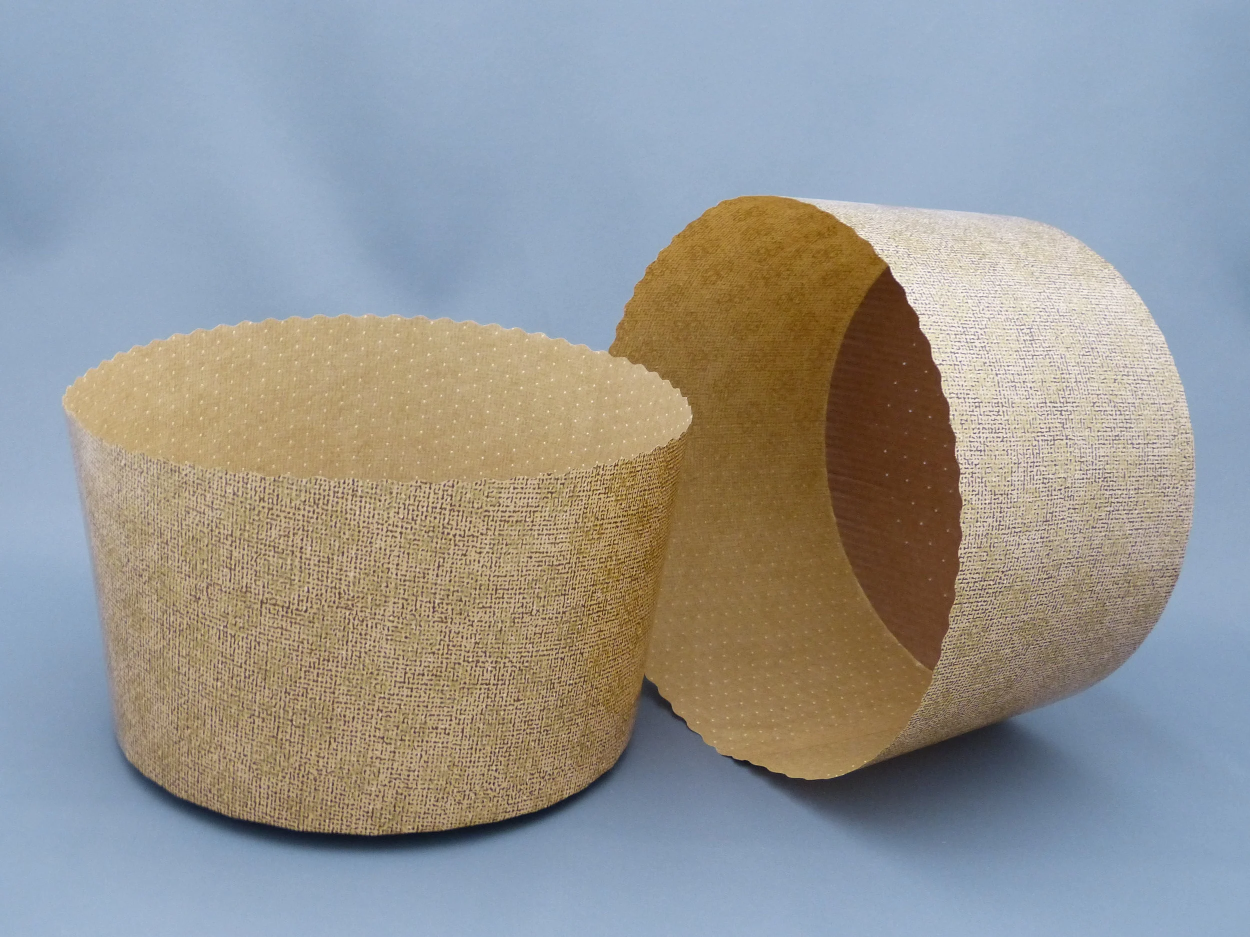 Our traditionally styled P170 - Panettone molds are made with a single paper side and corrugated cardboard bottom which enables the mold to perform as a free-standing mold that bakes evenly and has easy release characteristics. Our Panettone molds are oven safe up to 390°F, microwave and freezer safe, and grease resistant. The standard print features a gold background with speckles of brown.